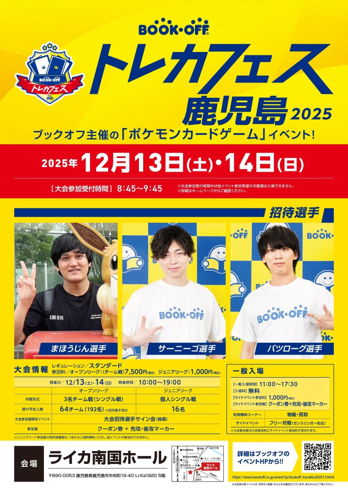 イベント&キャンペーン Home イベント&キャンペーン ホール トレカフェス鹿児島2025 トレカフェス鹿児島2025ホール 開催日 2025/12/13-2025/12/14 開催場所 ライカ南国ホール ブックオフ主催の「ポケモンカードゲーム」イベント!! 一般入場 【会場】ライカ南国ホール 【開催日】12月13日(土)14日(日) 【一般入場時間】11:30~17:30 【入場料】無料 【サブイベント参加料】1,000円(税込) 【サブイベント参加賞】クーポン券+先攻・後攻マーカー 詳細はブックオフイベントページからご確認ください。 イベントホームページ 記事一覧へ戻る