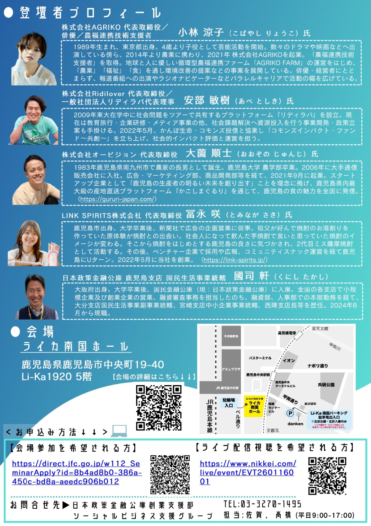 問合:日本政策金融公庫 国民生活事業本部 創業支援部 ソーシャルビジネス支援グループ ☎︎ 03-3270-1495(担当:佐賀、髙橋)