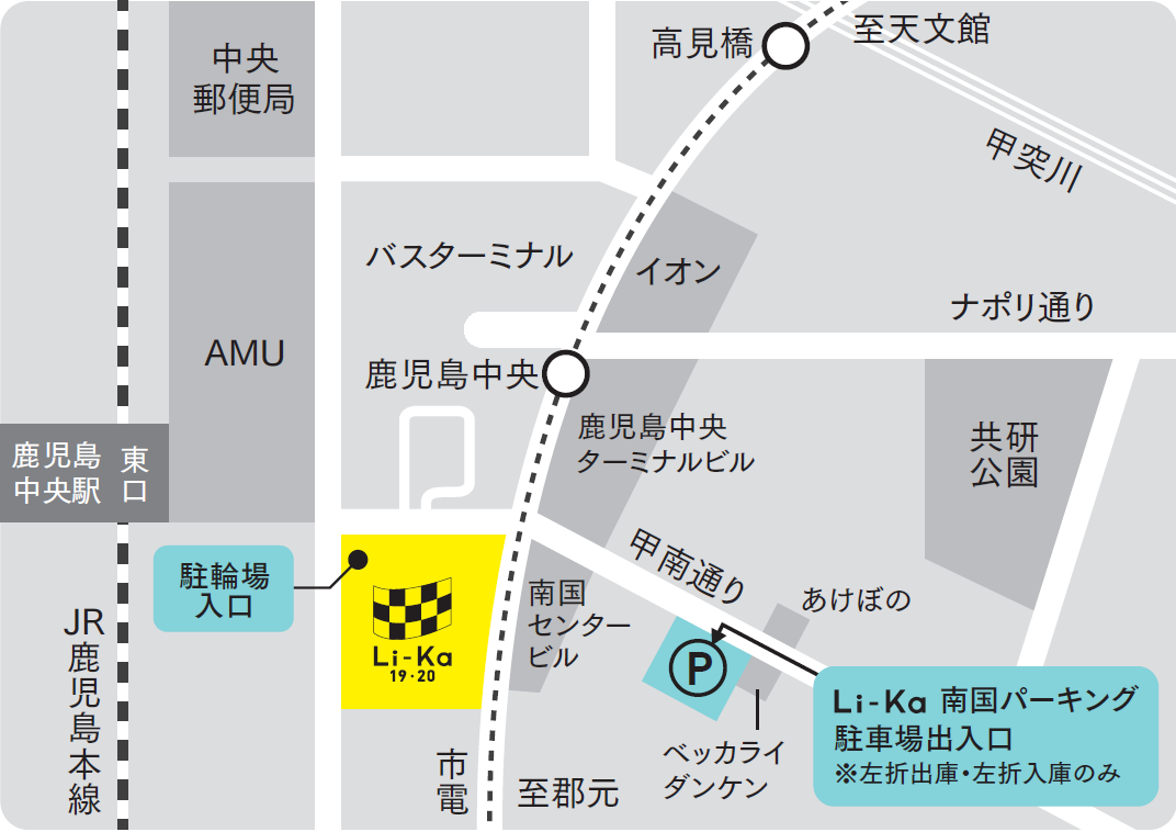 - 九州自動車道で鹿児島ICから約10分、鹿児島北ICから約15分 ※Li-Ka1920 施設内には駐車場はございません。隔地駐車場(Li-Ka南国パーキング)をご利用ください。