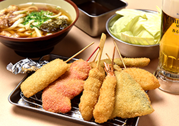 大阪のB級グルメ串カツの専門店で、全国に展開しています。衣 ・ 油 ・ ソースすべてがオリジナルブレンドで全店、味のブレがありません。秘伝のレシピで作られた串カツを大衆酒場の雰囲気でお楽しみいただけます。
