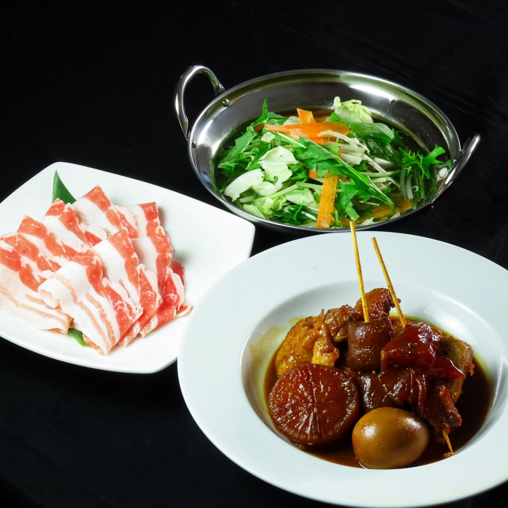 独自のダシに鹿児島の甘めの味噌で煮込んだ味噌おでん、大隅の南州農場で元気に育ったかごしま黒豚・黒牛の3種類の出汁しゃぶしゃぶ、屋久島から直送の飛魚の姿揚げ・さつま揚げなど鹿児島の食の美味しさを堪能できる元気な屋台。